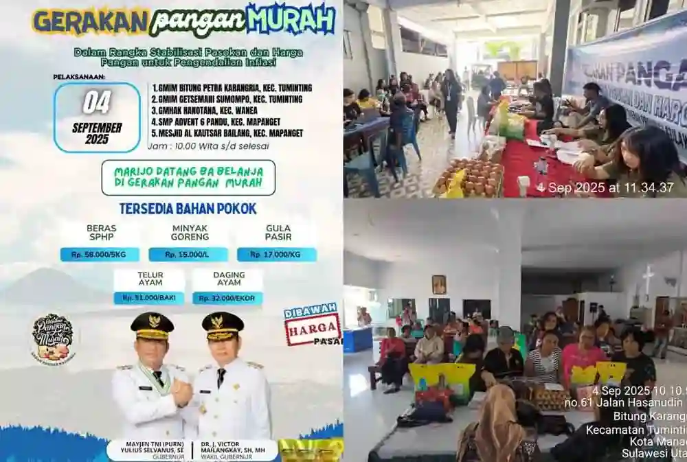 Manado, Portalsulutnew.com – Pemerintah Provinsi Sulawesi Utara kembali menunjukkan keberpihakan nyata kepada masyarakat melalui program Gerakan Pangan Murah (GPM). Di bawah kepemimpinan Gubernur Mayjen TNI (Purn) Yulius Selvanus, SE, GPM hadir serentak pada Kamis (4/9/2025) di lima titik strategis Kota Manado.