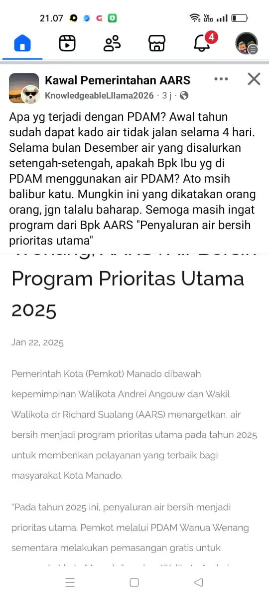 Kekecewaan warga tumpah di media sosial. Sejumlah unggahan di Facebook terutama di grup Kawal Pemerintahan AA-RS menyuarakan keresahan yang sama yakni air mati berhari-hari, distribusi tidak stabil sepanjang Desember, hingga sindiran bahwa “kado” Tahun Baru 2026 justru berupa krisis air.