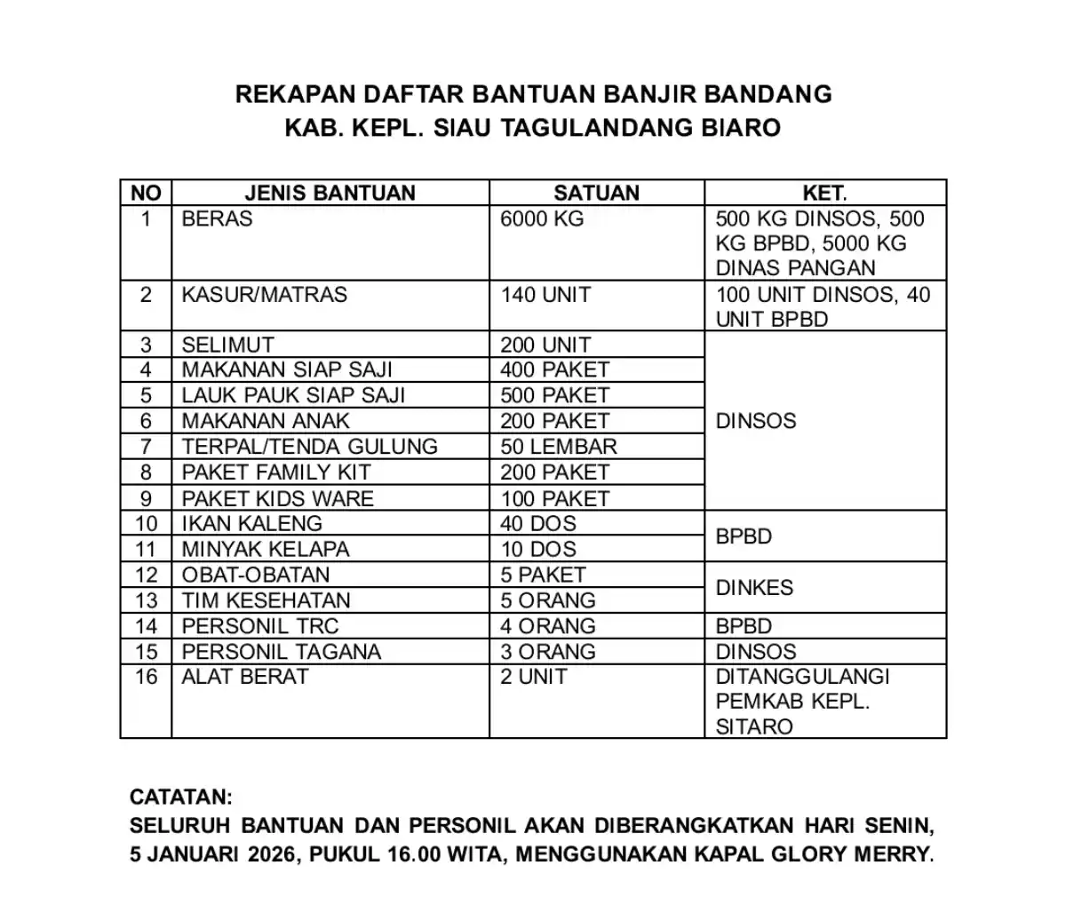 Senin (5/1/2026) sore sekitar pukul 16.00 WITA, bantuan logistik beserta sekitar 500 personel gabungan resmi diberangkatkan dari Pelabuhan Manado menuju lokasi bencana.