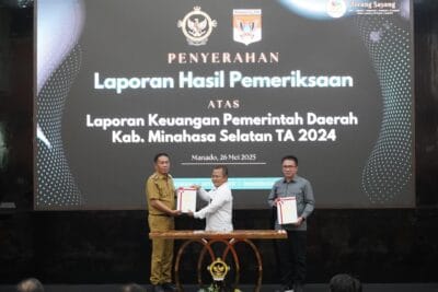 PORTALSULUTNEW.COM — Badan Pemeriksa Keuangan Republik Indonesia (BPK-RI) menyerahkan predikat Opini Wajar Tanpa Pengecualian (WTP) kepada Pemerintah Kabupaten (Pemkab) Minahasa Selatan (Minsel), atas Laporan Hasil Pemeriksaan (LHP) keuangan tahun anggaran 2024., bertempat di Kantor BPK-RI Perwakilan Sulut di Jalan 17 Agustus Manado, Senin (26/05/2025)siang tadi.