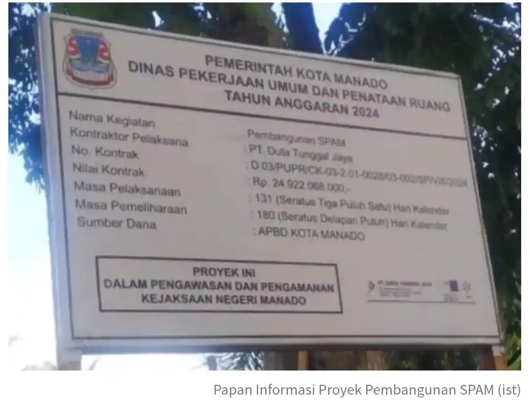 Diketahui, Proyek Pembangunan Sistem Penyediaan Air Minum (SPAM) Kota Manado dengan banderol anggaran Rp24,9 yang bersumber dari APBD Pemkot Manado Tahun Anggaran 2024 disinyalir mangkrak. Proyek yang berlokasi Desa Lotta, Kecamatan Pineleng, Kabupaten Minahasa, hingga Februari 2024 tidak selesai. ***