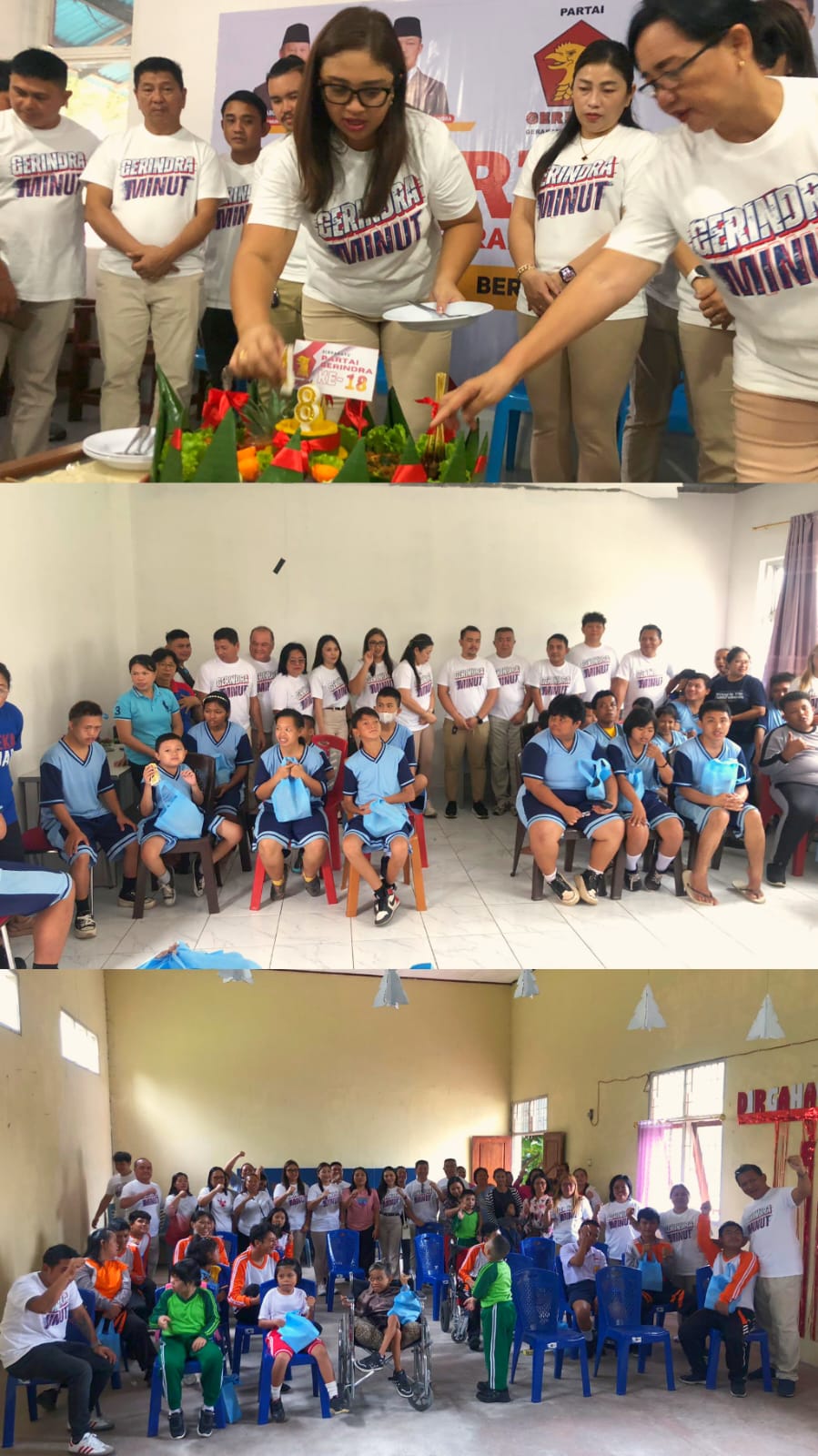 Dalam kunjungan tersebut, Jajaran Pengurus dan anggota DPC Partai Gerindra Minut merayakan HUT ke-18 bersama anak-anak di sekolah SLB, berbagi kasih dengan menyerahkan bingkisan dan uang tunai.