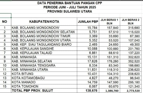 Sumber Data Tunggal Sosial Ekonomi Nasional (DTSEN) Kementrian Sosial menyebutkan. Jumlah Penerima Bantuan Pangan (PBP) di Sulut berjumlah 138.676 penerima yang tersebar di 15 Kabupaten dan Kota.